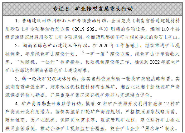 合理設(shè)置礦業(yè)權(quán)。全面實行礦業(yè)管理、生態(tài)修復(fù)“雙負(fù)責(zé)”制度,逐礦落實規(guī)劃和項目環(huán)評、排污許可制度,統(tǒng)籌用礦、用地、用林審批。規(guī)范財政出資勘查項目管理,嚴(yán)格控制投放商業(yè)性探礦權(quán),地質(zhì)勘查重點(diǎn)轉(zhuǎn)向民生所需礦產(chǎn)、新興能源和戰(zhàn)略性礦產(chǎn),以及水文地質(zhì)、工程地質(zhì)、環(huán)境地質(zhì)等工作領(lǐng)域。優(yōu)化采礦權(quán)結(jié)構(gòu),除國家戰(zhàn)略礦種、附加值高、為產(chǎn)業(yè)配套以及保障民生需求情形外,不再新設(shè)采礦權(quán),規(guī)范已設(shè)采礦權(quán)延續(xù),加快淘汰落后產(chǎn)能,到2025年底全省采礦權(quán)數(shù)量控制在3000宗以內(nèi),其中砂石土礦采礦權(quán)數(shù)量不超過1500宗。