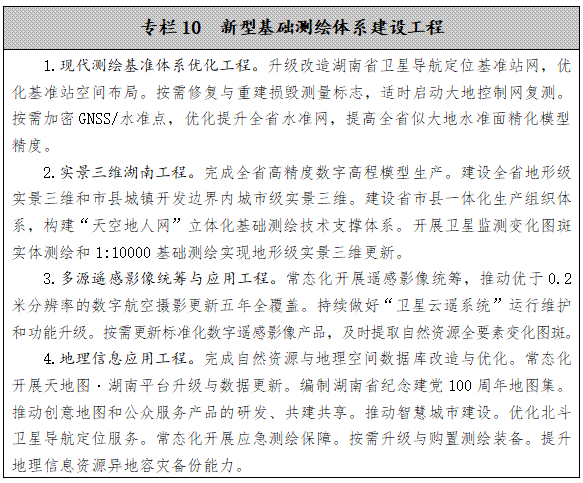 推進(jìn)新型基礎(chǔ)測繪體系建設(shè)。在做好全省1:10000地形圖和市縣城鎮(zhèn)開發(fā)邊界內(nèi)1:500地形圖生產(chǎn)更新的基礎(chǔ)上,以“滿足要求、貼近需求”為導(dǎo)向,推進(jìn)新型基礎(chǔ)測繪體系和實景三維湖南工程建設(shè),建立以實景三維湖南為核心的新型基礎(chǔ)測繪產(chǎn)品體系,帶動生產(chǎn)組織體系、標(biāo)準(zhǔn)政策體系、技術(shù)支撐體系和應(yīng)用服務(wù)體系的全面重構(gòu)。按照“試點(diǎn)驗證、按需精化、以用促建、省市聯(lián)動”的思路,基本建成覆蓋全面、更新及時、管控精準(zhǔn)、立體直觀、承載力強(qiáng)的實景三維湖南和省級統(tǒng)籌、聯(lián)動更新、開放共享、按需服務(wù)的湖南省新型基礎(chǔ)測繪體系。